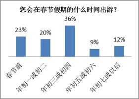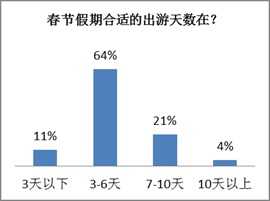 超6成客户认为春节假期合适的出游天数在3-6天,36%的客户倾向于年初三或初四出行,其次是春节前(23%)、年初一或初二(20%)。