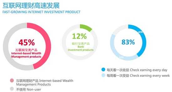 尼尔森在调查中让消费者对余额宝和银行理财产品做了比较,发现消费者对余额宝收益率的预期普遍低于银行理财产品,网购方便、起购点低、流动性好都是消费者青睐互联网理财产品的主要原因。此外,四成的余额宝用户表示,他们平均每天查看收益,超过八成的用户至少每周查看一次收益。有的用户说“虽然收益不多,但看到今天的收益赚到一顿午饭就非常高兴”,这句话生动的体现出了互联网理财带给消费者的愉快的投资理财体验。
