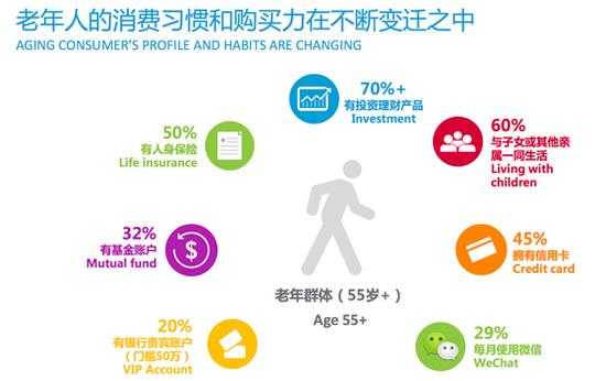 尼尔森调研发现,老年人退休前所处的时代背景和消费习惯直接影响了他们进入老年后的消费能力和投资理财观点。在城市受访的55岁以上老年人中,70%以上有投资理财产品,半数老年人拥有人身保险,45%持有信用卡,约五分之一的老年人有银行贵宾帐户(拥有至少50万元人民币的银行存款),近三成老年人会使用微信与人交流。