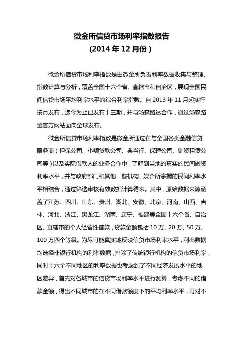 微金所:2014年12月信贷市场利率指数 更多阅读:微金所:2013年9月-2014年11月中国民间利率市场化报告企鹅智酷:2016年中国互联网金融指数报告2023年3月信贷再超预期,居民消费潜能仍待释放纽约联邦储备银行:2020年第四季度家庭债务和信贷报告中国人口协会:2014年中国女士性福指数调查Henley&Partners:2024年亨利全球护照指数排名2017年12月全球主要国家和地区制造业PMI指数携程:2020目的地复苏指数报告App Annie:2014年5月美国大众及商业新闻指数:移动平台的新闻应用中国互联网大数据—蓝色幸福指数城市报告美兰德:2015年第28周电视节目网络传播指数中国汽车流通协会:2019年10月份中国二手车经理人指数为51.6%百度指数:2019年1月汽车行业BEI品牌参与度指数Fiksu:2017年1月份移动应用CPM指数App Annie :2016 年6月全球移动应用指数
