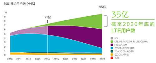 2014年,全球的LTE用户规模同比增长了45%,达到4亿左右,而中国的LTE用户已经突破8千万,月均用户增长率超过50%。预计2020年,全球的LTE用户将达到35亿,占整个移动宽带用户的42%左右。