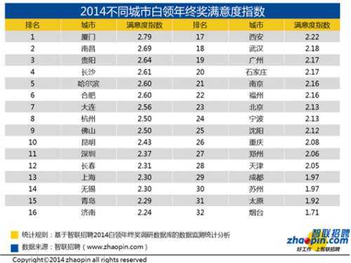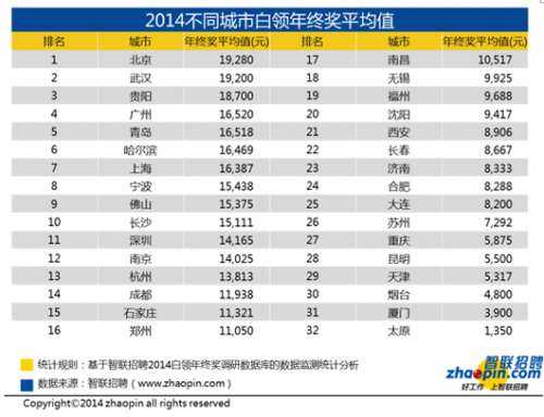 智联招聘最新推出的2014白领年终奖调查报告显示,2014年白领年终奖预计发放比例不足四成,北京地区年终奖均值近2万元,全国最高。其中,青岛年终奖平均值为16518元,位居全国第五,尽管如此,青岛白领对年终奖满意度指数在全国排名15位。