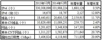 截至2014年12月,我国IPv4地址数量为3.32亿,拥有IPv6地址18797块/32。