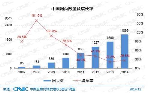 截至2014年12月,中国网页 数量为1899亿个,年增长26.6% 。