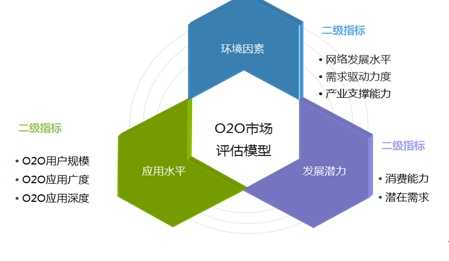 O2O市场评估模型的统计指标包括三个维度:环境因素、应用水平、发展潜力,这三个维度始终存在于O2O发展的全生命周期中。O2O的环境因素,主要反映一个区域支撑O2O发展的经济、社会、技术基础设施的发展水平。特别反映一个区域O2O产业发展就绪的潜力,即个人、企业利用互联网使线下商品或服务与线上相结合,线上生成订单,线下完成商品或服务交付的基础条件,如互联网的使用、电子支付方式的使用、快递服务的效率、O2O的安全诚信水平等。O2O的应用水平,主要反映O2O消费的规模、应用广度和应用深度等。例如:O2O用户规模、O2O用户覆盖面、O2O业务覆盖面、O2O应用使用程度等。O2O发展潜力,主要从潜在消费角度评估一个区域O2O产业发展潜力和市场机会。例如:O2O消费能力、O2O消费意愿。