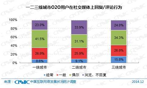 一线城市O2O用户在社交媒体上的互动频率不高,41.5%的人偶尔进行回复和评论;二线城市O2O用户互动行为不强,33.9%的人只浏览、不回复;反而,三线城市O2O用户互动意愿和程度相对更高,15.8%的人经常回复和评论。