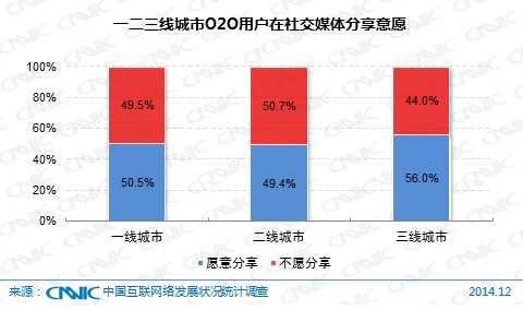 一二三线O2O用户中每两个人中,有一个人愿意在社交媒体上分享消费体验。其中,三线城市O2O用户的分享意愿更强烈一些,这部分人群占比56% 。
