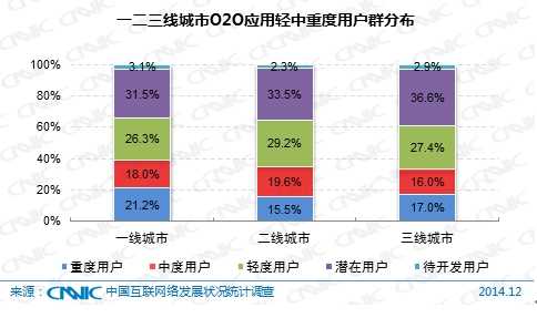 研究过程中,CNNIC将“经常使用”O2O应用的用户定义为重度用户,将使用程度“一般”的用户定义为中度用户,将“偶尔使用”的用户定义为轻度用户,将“知道但没用过”的用户定义为潜在用户,将“根本不知道”的用户定义为待开发用户。