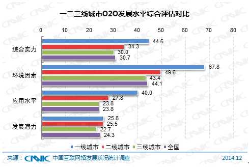 研究显示,一线城市O2O市场综合实力最强,良好的网络环境基础为O2O市场发展奠定坚实基础;O2O企业在一线城市的率先布局,迎合用户较强的O2O信息获取需求,迅速集聚了颇具规模的O2O用户;一线城市较高的消费能力和互联网应用水平,促使大量网民转化为深度O2O用户;由于一线城市非O2O用户成功转化的概率与二三线城市相当,一线城市O2O发展重点将转向深化用户O2O应用行为,提升消费档次和使用频度。二三线城市的网络发展环境和产业支撑能力发展水平较高,将以培养用户O2O消费习惯,迅速拓展用户规模为发展重点。