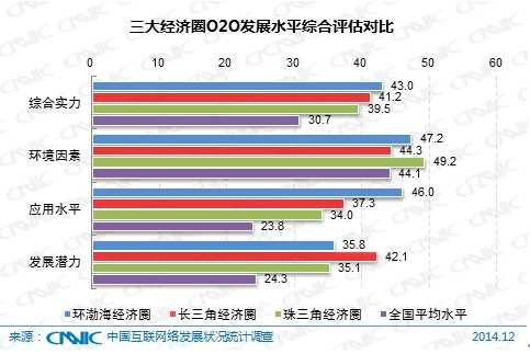 三大经济圈O2O市场综合实力均大幅领先于全国平均水平8.5分以上。环渤海经济圈的综合实力最强,为43分;长三角经济圈位居其次,为41.2分;珠三角经济圈排在第三位,为39.5分。