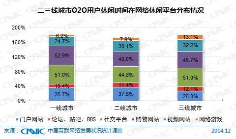 一线城市O2O用户在休闲时间喜欢社交和购物,其使用社交平台和购物网站的概率最高;二线城市O2O用户在休闲时间倾向于阅读获取信息,其使用门户网站的概率最高;三线城市O2O用户更依赖于社交和娱乐,其使用社交平台、登陆视频网站和玩网络游戏的概率最高。