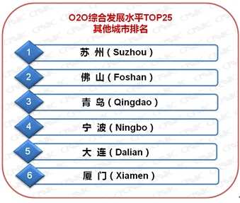 横向比较其他城市O2O综合发展水平,苏州、佛山、青岛位列前三名,宁波、大连、厦门分列第四至第六位。究其原因:苏州产业支撑能力较强;O2O信息需求较大;团购餐饮O2O用户渗透率较高,为25.4% 。佛山网络发展水平较高;O2O用户渗透率较高,为62.5%;其中,酒店预订O2O用户渗透率为20.8%,旅游度假产品O2O用户渗透率为13.7% 。青岛机票O2O用户渗透率较高,为21.6%;网上叫车O2O用户渗透率较高,为30%;非团购餐饮O2O用户转化成餐饮O2O用户概率较高,为34.1% 。宁波产业支撑能力较强;订餐订座O2O用户渗透率为22.1%,医疗O2O用户渗透率为17.9%;非O2O用户转化为O2O用户的概率较高,非休闲O2O用户转化概率为31.9%,非网上叫车O2O用户转化概率为30.8%,非家政O2O用户转化概率为26%,非医疗O2O用户转化概率为30.1% 。大连非订餐订座O2O用户转化为餐饮O2O用户的概率较高,为32.4% 。厦门网络发展水平较高;休闲O2O用户渗透率较高,为25.6% 。
