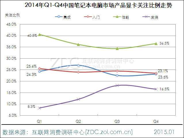 对比2014年Q1-Q4产品显卡关注度数据,性能级显卡Q1-Q3呈下滑走势,Q4逐渐回升至36.5%,较Q1下滑4.0%。与之相比,发烧级显卡产品热度则呈上升走势,用户关注度由8.3%升至16.5%,增加8.2%。