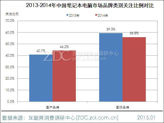 图1 2013-2014年中国笔记本电脑市场品牌类别关注比例对比