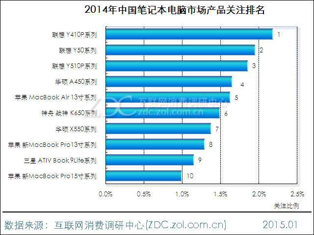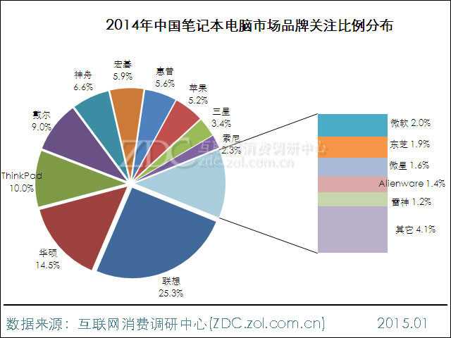 ZDC监测数据显示,2014年中国笔记本电脑品牌关注榜上,前十五名厂商累计占据95.9%的市场关注份额,其它厂商上升空间有限。