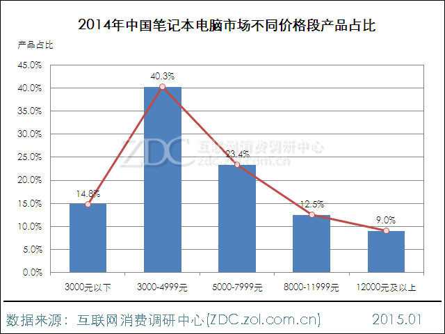 ZDC监测数据显示,2014年中国笔记本电脑市场在售产品数量达到4804款,较2013年减少939款,市场竞争较为激烈。具体分布方面,今年3000-4999元价格段产品基数相对最高,占比达到40.3%。5000-7999和3000元以下价格段次之,产品占比分别为23.4%和14.8%。与之相比,8000元以上高端市场由于受众范围较窄,产品占比均在15.0%以下。