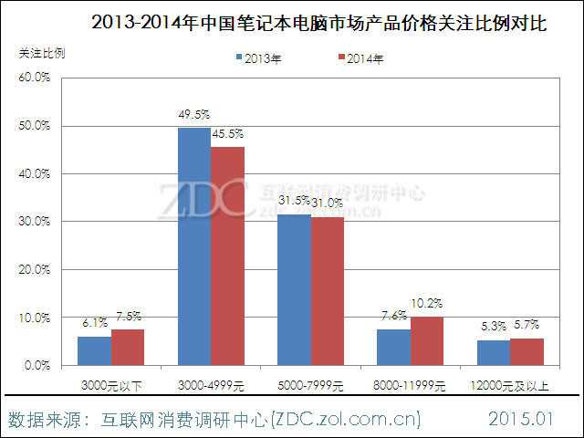 2014年中国笔记本电脑市场上,由于3000-4999元价格段产品需求量较大,用户关注度相对最为集中,所占份额达到45.5%。5000-7999价格段以31.0%的关注比例排在第二位,其它价格段用户关注度较低。同2013年相比,今年3000-4999元价格段用户关注度下滑4.0%。流失的关注份额主要转向8000-11999元市场。