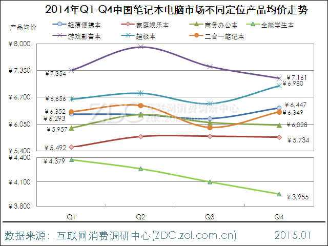 图8 2014年Q1-Q4中国笔记本电脑市场不同定位产品均价走势
