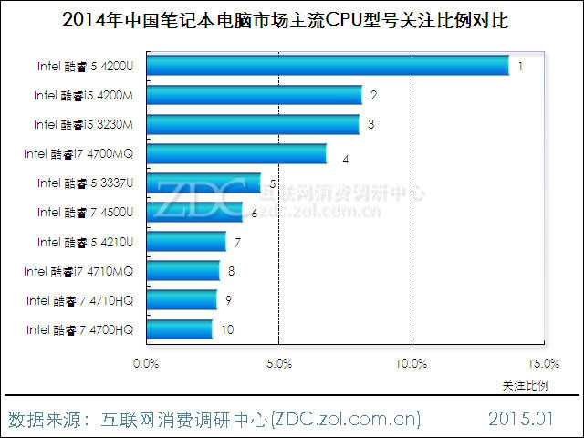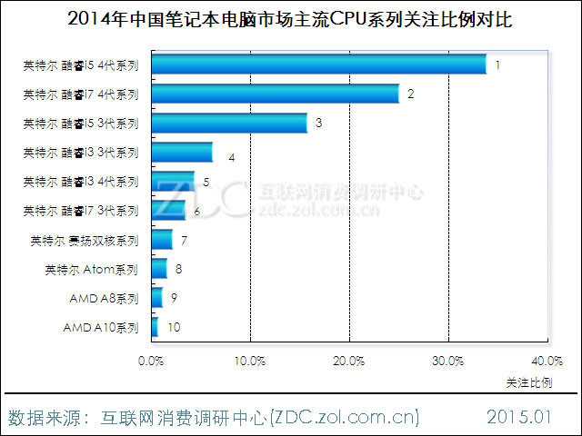 图10 2014年中国笔记本电脑市场主流CPU型号关注比例对比