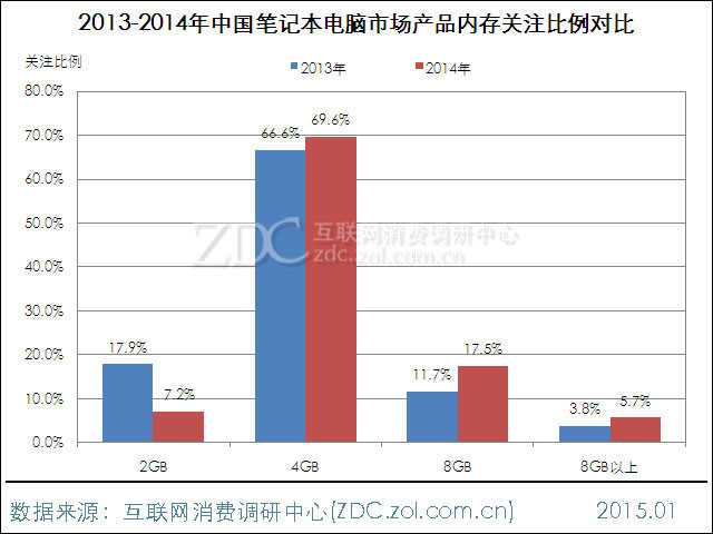 2014年中国笔记本电脑市场上,4GB内存容量产品继续领跑,所占关注份额接近七成。其他存储容量中,8GB内存产品用户关注度相对较高,占比为17.5%。