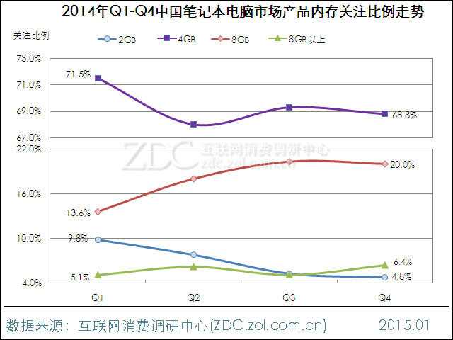 图17 2014年Q1-Q4中国笔记本电脑产品内存关注比例走势
