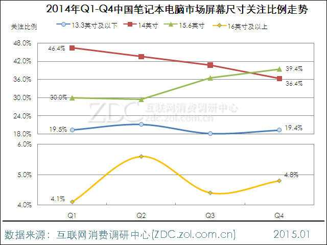 图22 2014年Q1-Q4中国笔记本电脑市场屏幕尺寸关注比例走势