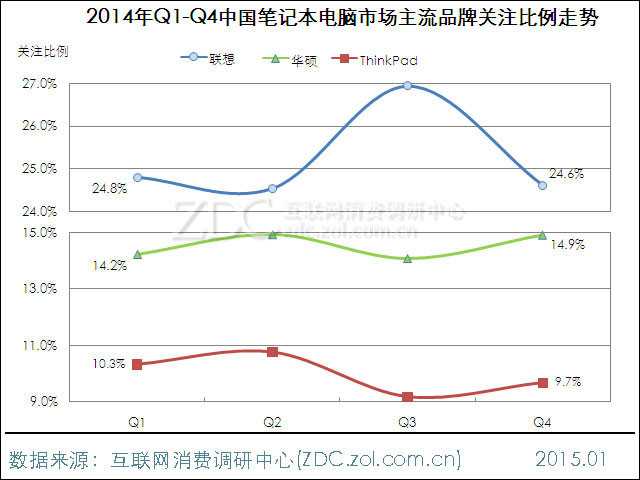 图25 2014年Q1-Q4中国笔记本电脑市场主流品牌关注比例走势