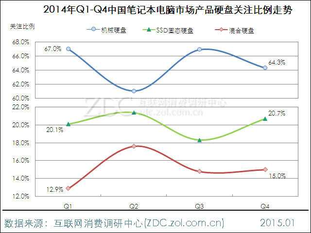 图14 2014年Q1-Q4中国笔记本电脑市场产品硬盘关注比例走势