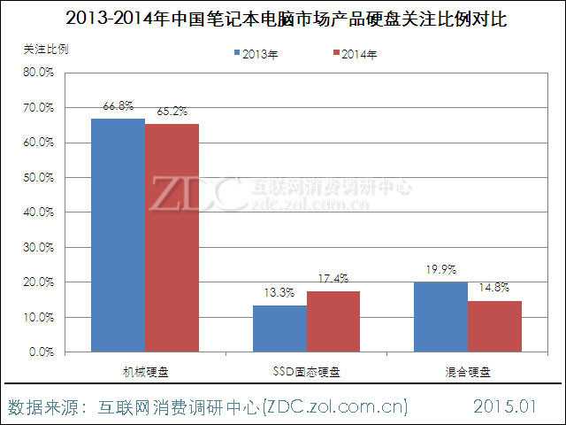ZDC监测数据显示,2014年笔记本电脑市场上,机械硬盘产品依旧占据主导地位,用户关注度高达65.2%。搭载SSD固态硬盘和混合硬盘产品用户关注度相对较低,分别为17.4%和14.8%。同2013年相比,今年SSD固态硬盘产品用户关注度小幅上涨4.1%,增加的关注份额主要来自机械硬盘和混合硬盘。