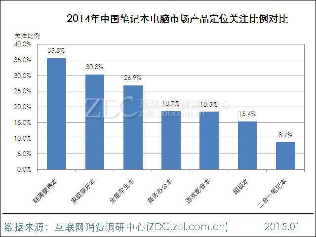 从产品定位的角度来看,2014年轻薄型产品依旧是各大厂商主推类型,用户关注度达到35.5%。家庭类和学生类产品分列第二、三位,所占关注份额为30.3%和26.9%。