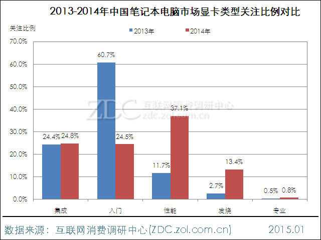 2014年搭载性能级显卡的产品用户关注度最为集中,份额达到37.1%。集成显卡和入门级显卡产品关注比例基本持平,分别为24.8%和24.5%。