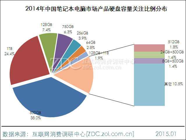 图15 2014年中国笔记本电脑市场产品硬盘容量关注比例分布