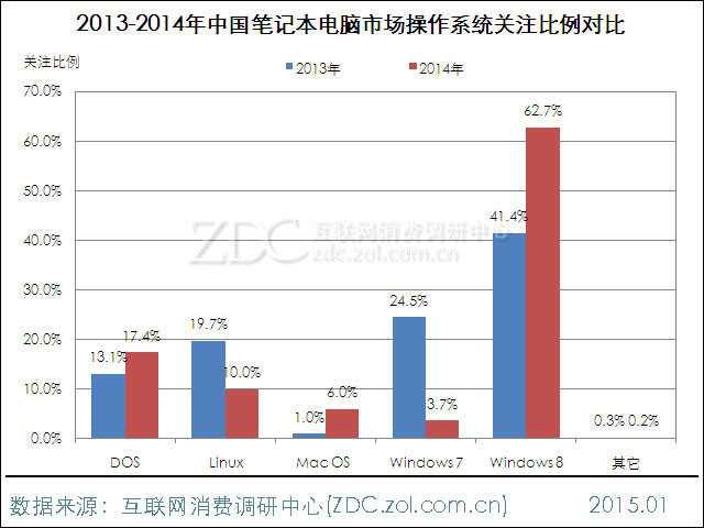 2014年中国笔记本电脑市场上,微软Windows系统占据统治性地位,用户关注度达到66.4%。其中,Windows 8系统独占62.7%,较2013年飙升21.3%,Windows 7系统产品关注度则大幅降至3.7%。