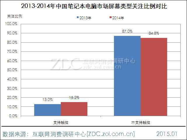 从产品屏幕功能的角度来看,2014年中国笔记本电脑市场上,不支持触控功能的产品用户关注度最为集中,占比高达84.8%。与之相比,支持触控的产品用户关注度仅为15.2%,较去年微升2.2%。近两年关注度数据反映出,笔记本电脑搭载触控屏并没有对市场造成更多的消费刺激。