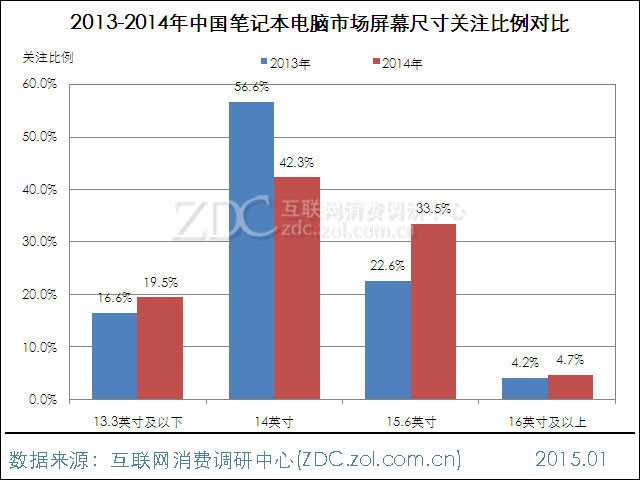 2014年中国笔记本电脑市场上,14英寸和15.6英寸产品占据市场主导地位,用户关注度分别为42.3%和33.5%。其它尺寸中,13.3英寸产品用户关注度相对较高,占比为19.5%。