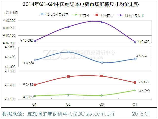 从产品均价的角度来看,2014年16英寸以上产品售价相对最高,均价在10000元以上,同时价格波动幅度明显。与之相比,13.3英寸以下、14英寸和15.6英寸产品均价相对稳定。