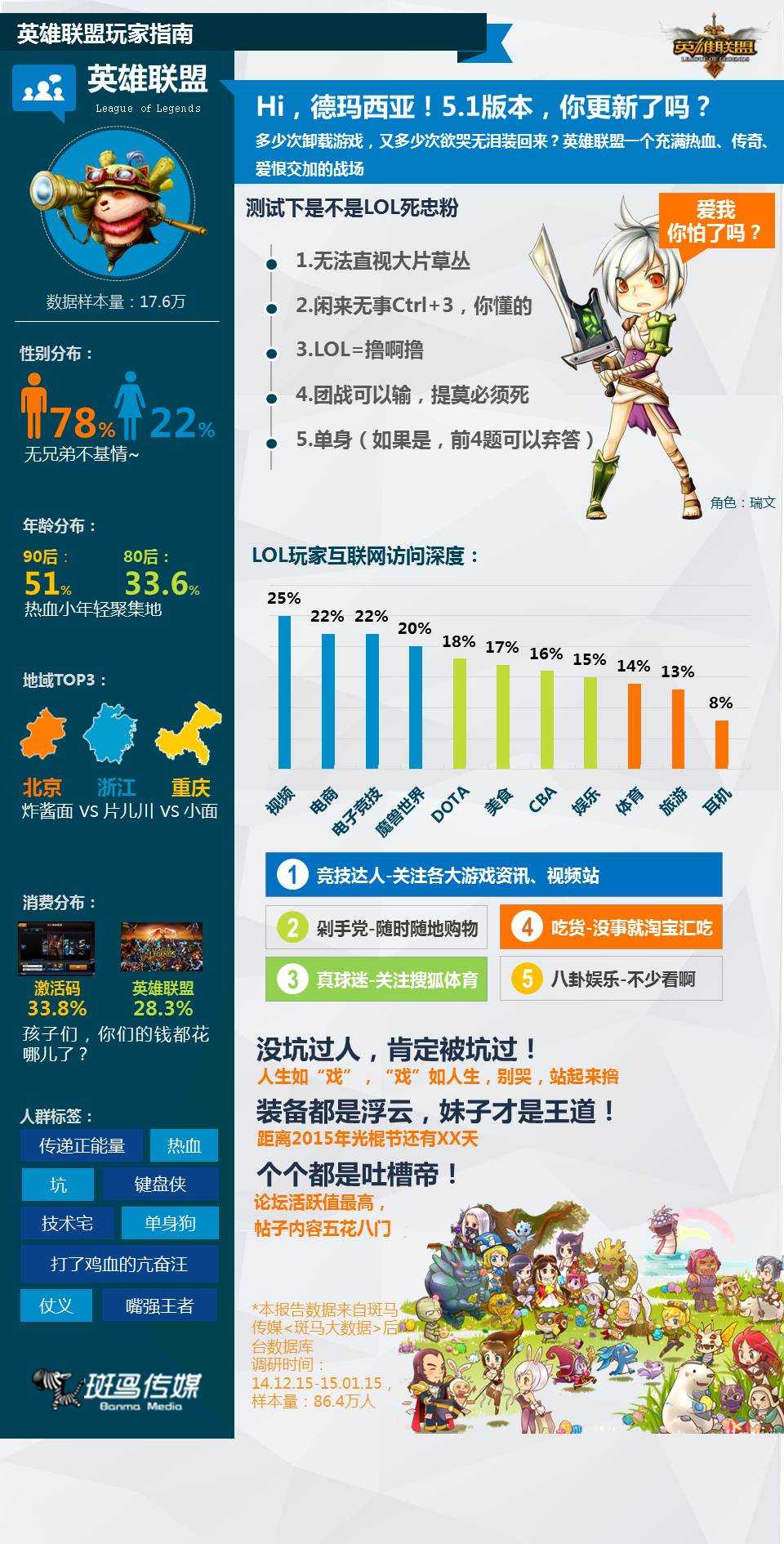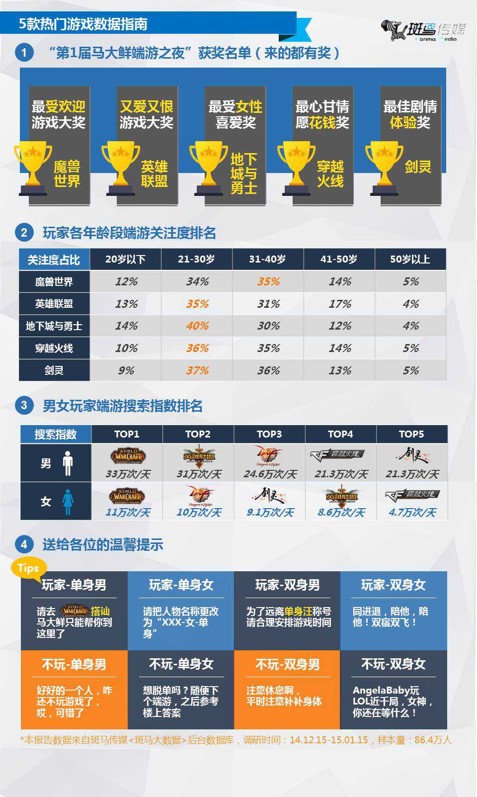端游指南,横扫单身汪聚集地! 《端游指南》基于斑马传媒<斑马大数据>后台监测数据及端游发展的深入洞察,对当前非常受关注的5款游戏的发展情况做出了基于统计数据的详细解读及人群浏览喜好的分析。 数据来源:斑马传媒<斑马大数据>后台数据库 样本量:86.4万人 调研时间:14.12.15-15.01.15 1 更多阅读:斑马:2014行业投放年终报告——汽车篇斑马&汽车之家:中国智能网联汽车用户行为与需求洞察报告机票大数据价格预测应用Hopper获得1600万美元投资大数据告诉你:如何在帝都开一家旺旺的茶馆“大数据”告诉你如何成为顶尖投资银行家大数据时代企业要如何应对CB Insights&Orrick:2012年VC青睐大数据初创公司 164家获得投资大数据带你玩转Facebook和Youtube网红营销有一种大数据,奶奶都爱看营销DT化,大数据推动品牌战术升级大数据驱动下的电商个性化推荐(PPT)阿里全息大数据构建与应用-PPT大数据知道你的心脏能不能跑马拉松互动派:大数据必将驱动企业变革从BAT看企业构建大数据体系的六层级