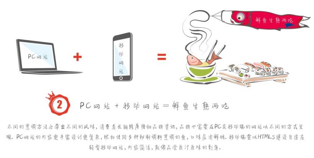 不同的烹调方法会带出不同的风味,消费者长期跨屏接触品牌资讯,品牌也需要在PC及移动端的网站以不同的方式呈现。 PC网站的内容更丰富设计更复杂,犹如使用多种秘制调料烹调的鱼,口味层次鲜明。移动端要以HTML5建设自适应轻型移动网站,内容简洁,就像品尝原汁原味的刺身。