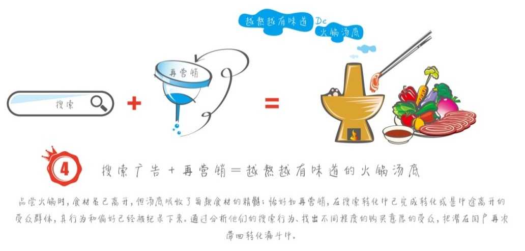 品尝火锅时,食材虽已离开,但汤底吸收了每款食材的精髓;恰好如再营销,在搜索转化中已完成转化或是中途离开的受众群体,其行为和偏好已经被纪录下来。通过分析他们的搜索行为、找出不同程度的购买意愿的受众,把潜在用户再次带回转化漏斗中。