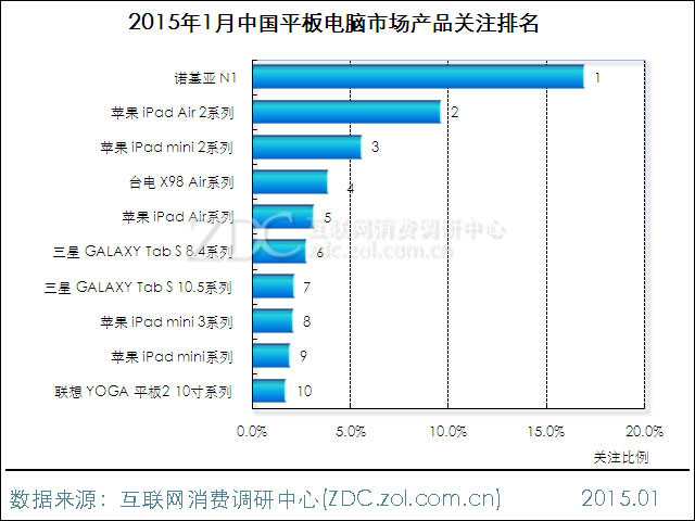 图1 2015年1月中国平板电脑市场品牌关注比例分布