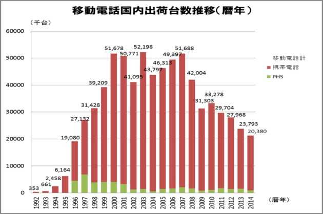 日本电子情报技术产业协会(JEITA)13 日公布的统计数据显示,2014 年日系手机厂于日本国内的手机出货量年减8.3% 至2038 万支;其中,2014 年日厂智能手机出货量年减 30.2%至919 万支,连续第 2 年呈现萎缩、且减幅创 2011 年开始公布年别出货量数据以来史上最大,年出货量并为史上首度跌破1000万支大关。