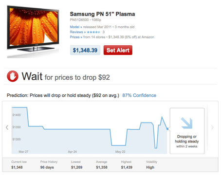 用户使用该网站则非常简单,登入Decide.com,在搜索框中输入具体想购买的电子产品,然后Decide.com便会根据自己专有技术预测给你返回是应当购买还是应当等一等的建议。