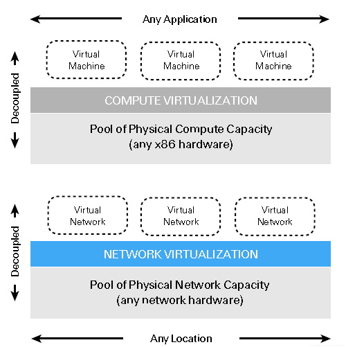 所谓解耦是指将网络的控制从网络硬件中脱离出来,交给虚拟的网络层处理。这个虚拟网络层加载在物理网络之上,在一个虚拟的空间重建整个网络。有了网络虚拟化,物理网络被泛化为网络能力池,正如服务器虚拟化把服务器设备转化为计算能力池。