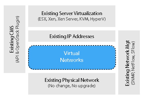加载的这层虚拟层无需现有的框架做出任何改变,原有网络硬件、原有的服务器虚拟化解决方案、原有的云管理系统、原有的IP都不需要改变:
