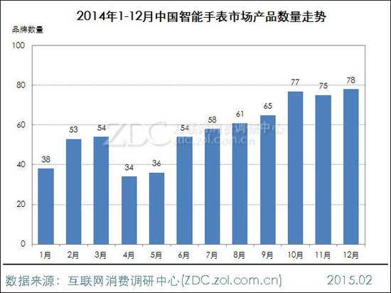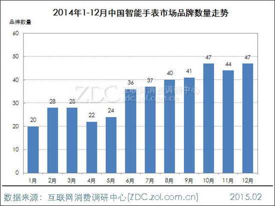 ZDC统计数据显示,2014年1月中国智能手表市场上参与竞争的品牌数量仅有20家,而到了6月,急剧增加至36家,8月便超过了40家。12月年底时则达到了47家,越来越多的厂商在加入智能手表的行列。