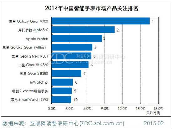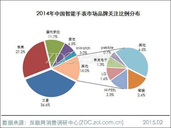 ZDC统计数据显示,2014年中国智能手表市场上,三星独占36.6%的关注比例,苹果则以27.2%的关注度位居亚军。摩托罗拉在智能手表的领域的市场影响力可圈可点,获得11.7%的关注比例。其他上榜品牌关注比例均在10%以下。