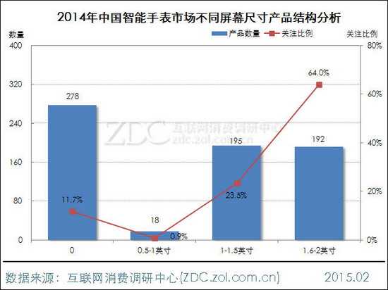 从不同屏幕尺寸产品的用户关注情况来看,2014年中国智能手表市场上,没有屏幕的产品数量最多,达278款,此类产品虽然没有屏幕但支持感应,如果双击表盘,时间等信息会在表盘上显示出来。