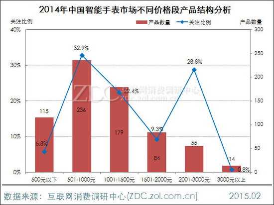 从价格段来看,2014年售价在501-1000元的智能手表数量最多,达到236款,同时也最受用户青睐,获得超三成的关注比例。售价在2001-3000元价格段智能手表获得了28.8%的关注比例,这与苹果iWatch售价在此区间有直接关系。