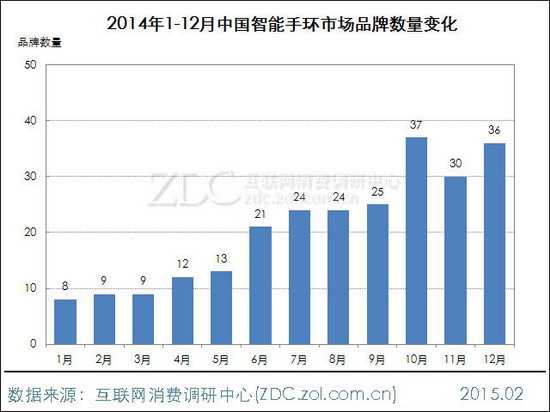 图9 2014年1-12月中国智能手环市场品牌数量变化