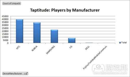 该公司发布的数据显示,《Taptitude》用户分布最广的平台是HTC移动设备,但诺基亚用户也在快速追赶(如上图所示)。据其所称,FourBros Studio看好迅速发展的Windows Phone市场前景,它是一个有利于独立开发者获得成功的平台。